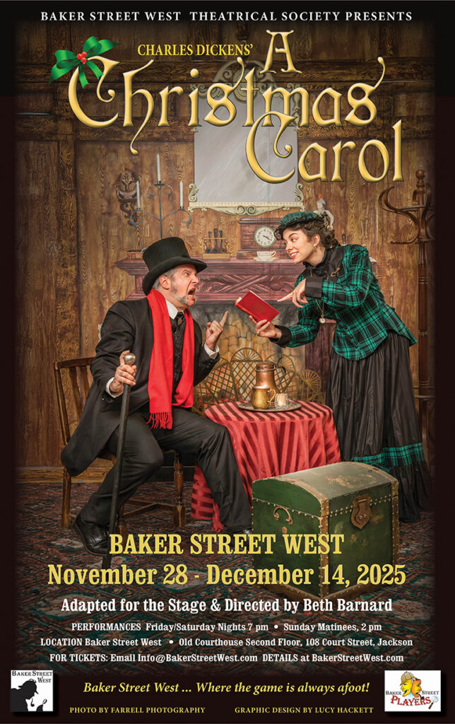 Baker Street Players’ popular holiday production opens Thanksgiving Weekend in the historic Old Courthouse in Jackson with performances Friday & Saturday Nights/Sunday matinees, 11/28 – 12/14. How to get tickets, you ask? Become a Founding Member of our new Baker Street West Theatrical Society (BSWTS)!